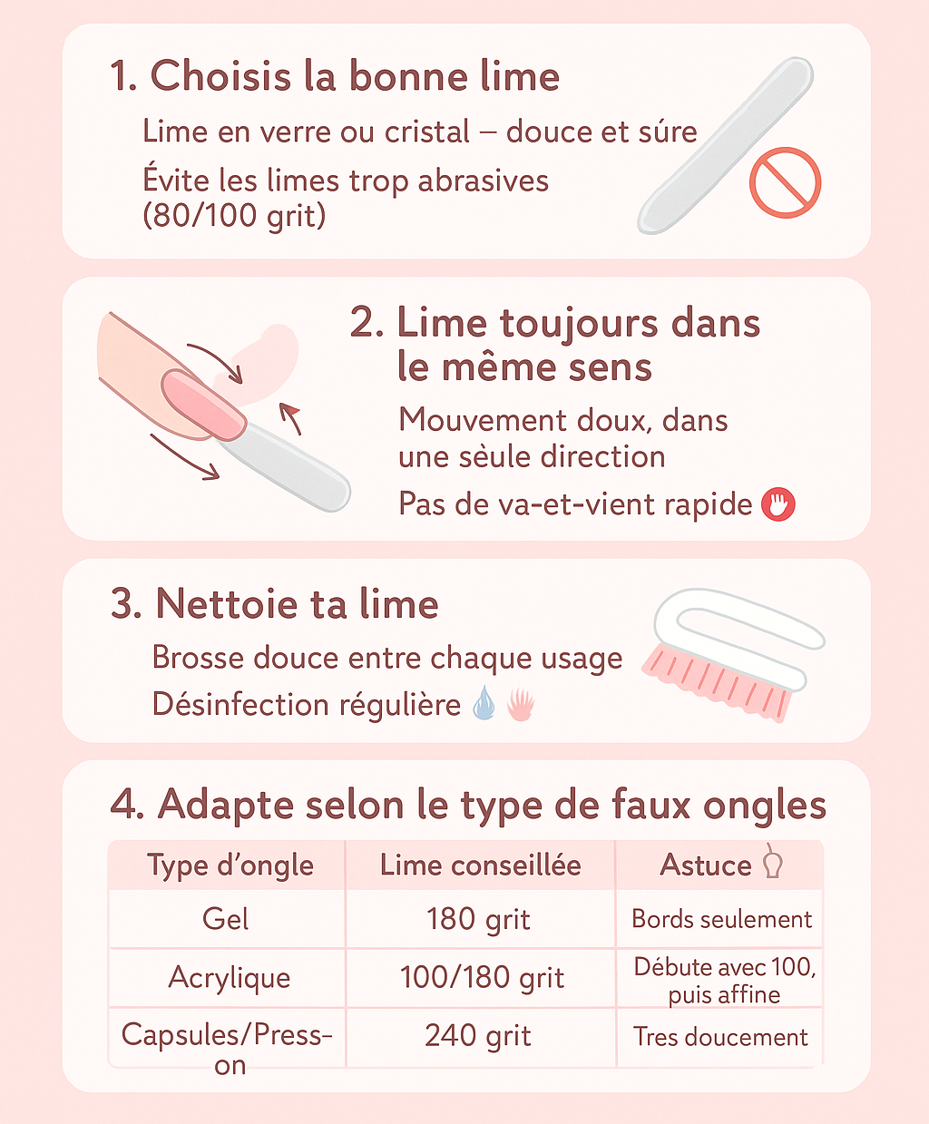 Il faut limer dans une seule direction, avec des mouvements lents et réguliers. Cela évite de fragiliser ou de décoller les faux ongles.